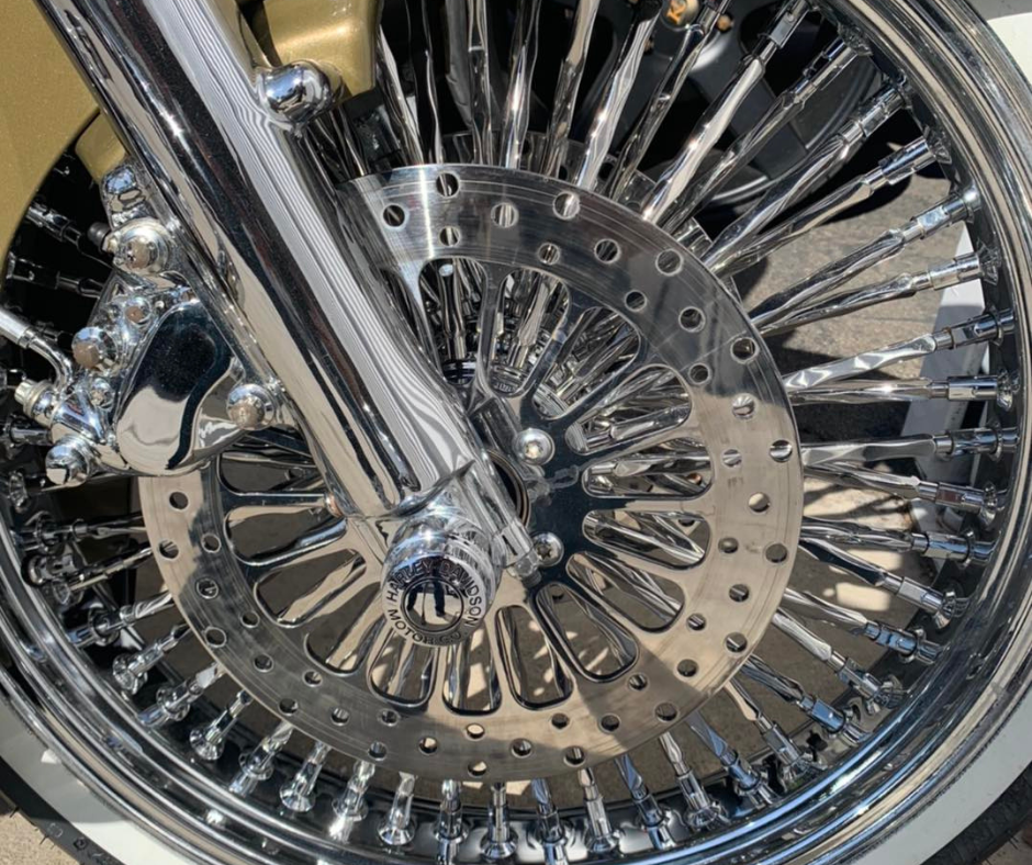 We install the legendary "Mammoth" 52-spoke wheels for that classic, heavy-duty custom look.